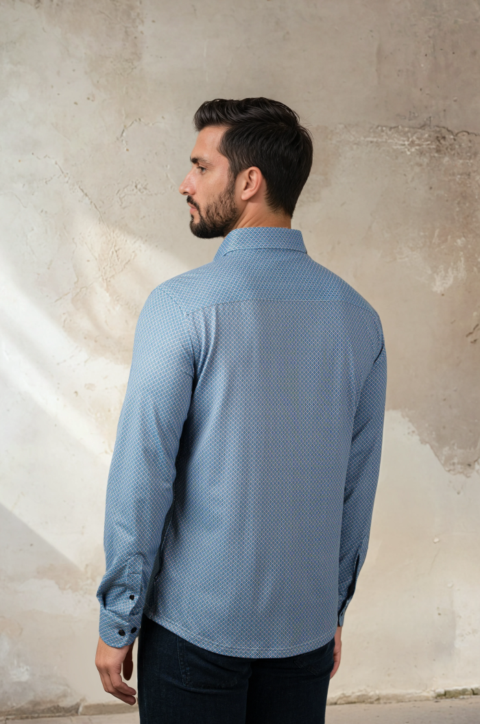 With a refined silhouette and a soft, wearable texture, the Dark Navy Interlinked Motif Shirt from our Apex Collection is built to transition with ease through any season.