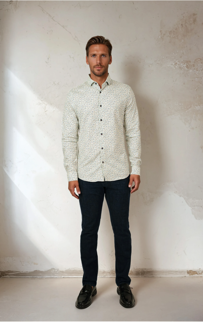The NOVA – Light Blue Meadow Ditsy Shirt from our Nova Collection is designed with an elegant drape and a smooth, peachy finish. Its clean silhouette and modern feel make it a versatile option for both casual and elevated looks.